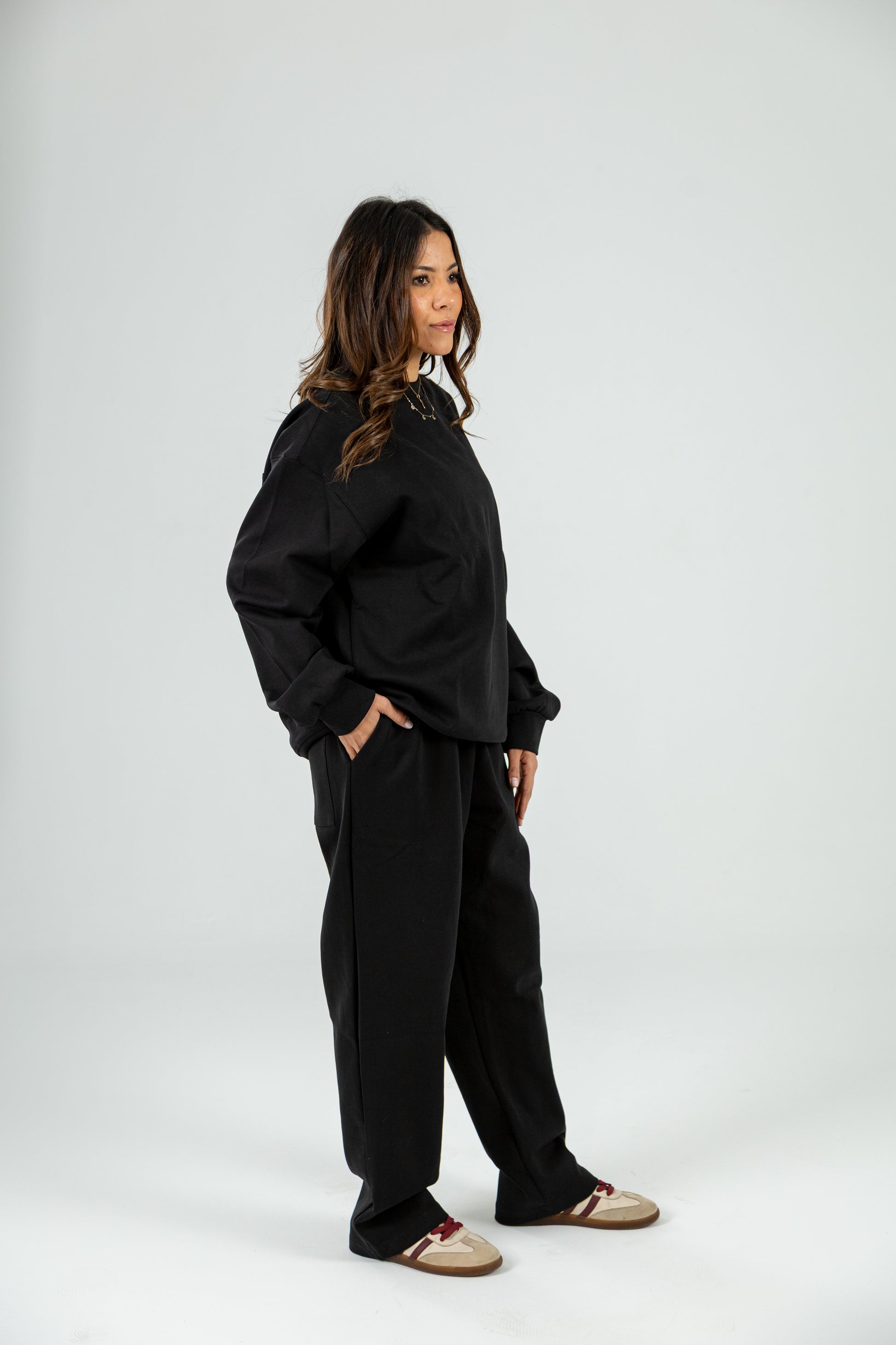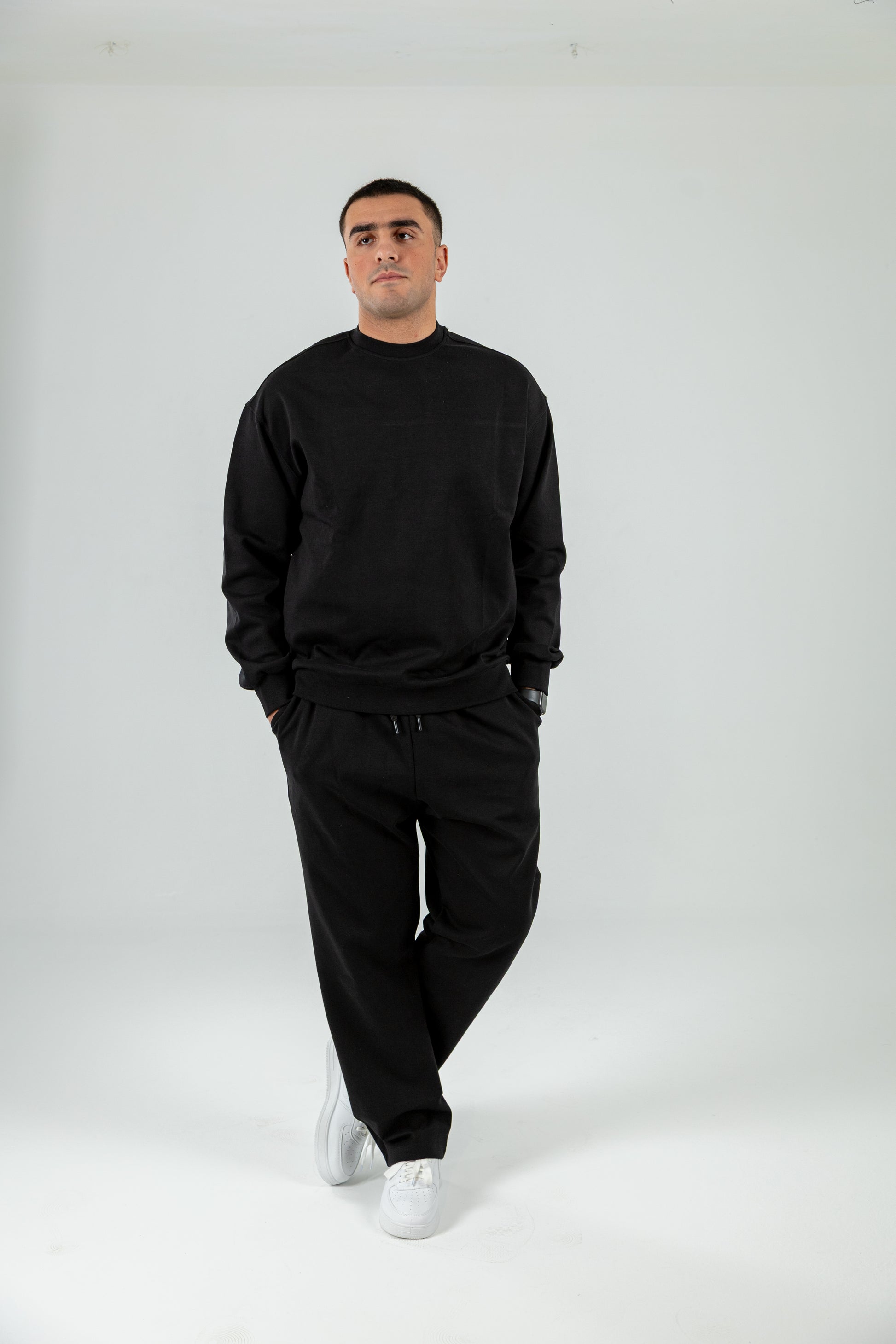 This oversized set is the perfect balance of comfort and style, offering a relaxed yet modern look. The set includes a soft, black crewneck sweatshirt and matching sweatpants, both made from premium materials designed for everyday wear. The sweatshirt features a classic crewneck design with ribbed cuffs, while the sweatpants are equipped with an elastic waistband and adjustable drawstrings for a customizable fit. Pairing effortlessly with white sneakers, this set is ideal for casual outings, lounging at home, or running errands in style. Whether you're dressing down for a chill day or looking for a streetwear-inspired look, this oversized set has you covered.